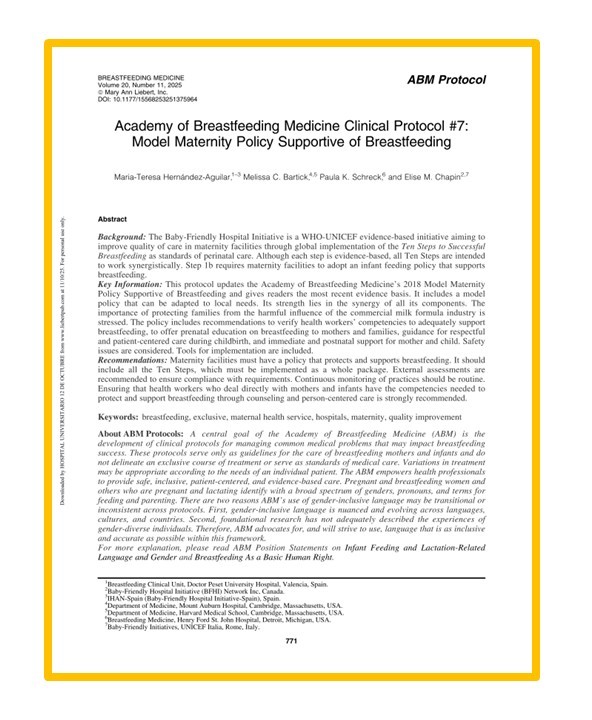 La Academy of Breastfeeding Medicine (ABM) ha publicado en la revista Breastfeeding Medicine la versión actualizada del Protocolo Clínico #7, Model Maternity Policy Supportive of Breastfeeding, un documento que se establece como la principal referencia mundial para la práctica de la lactancia materna.